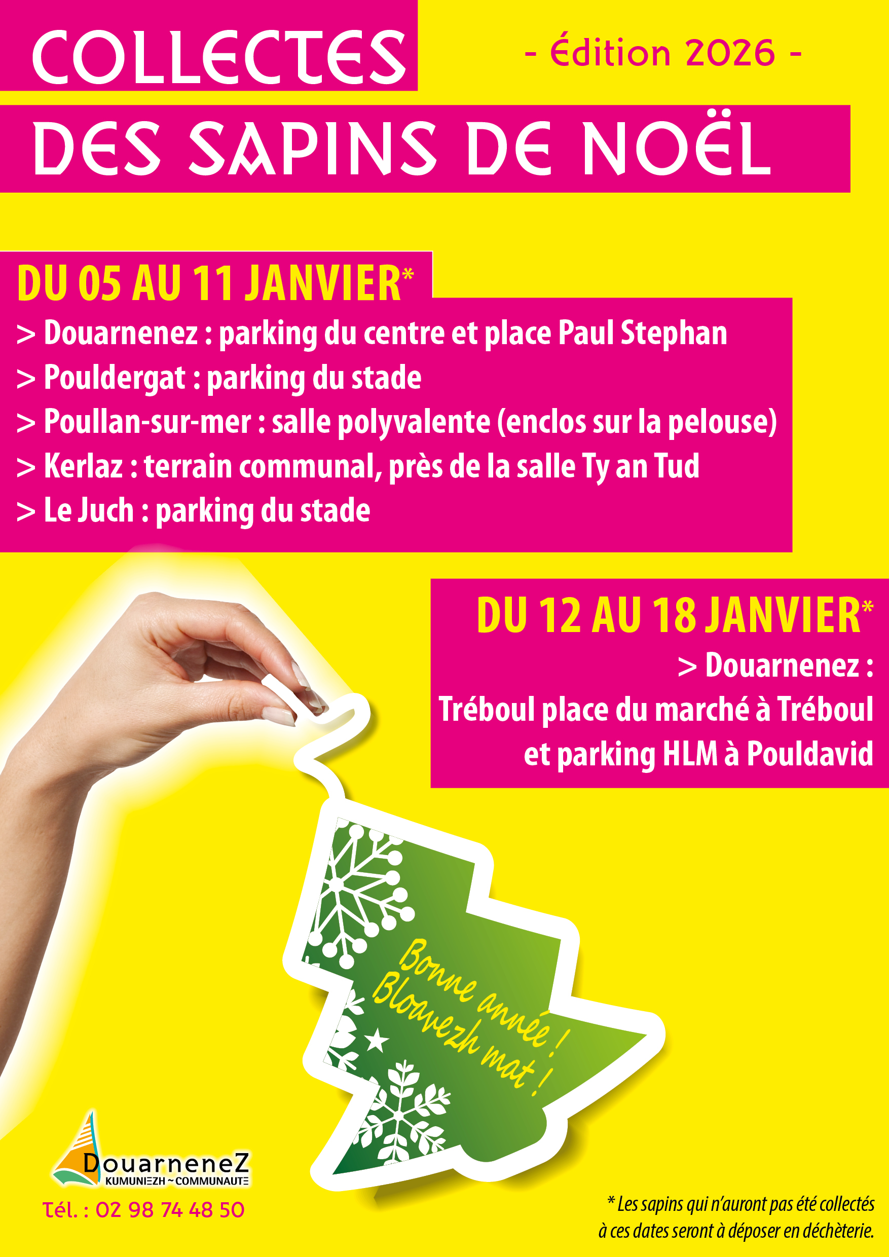 - Déchèterie communautaire de Lannugat à Douarnenez : elle sera fermée au public à 16h les 24 et 31 décembre 2025. Elle sera fermée le 25 décembre 2025 et le 01 janvier 2026. La déchèterie de Lestrivin à Poullan-sur-mer est fermée jusqu’à mi-avril 2026 pour travaux.