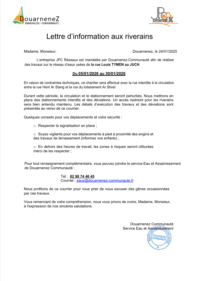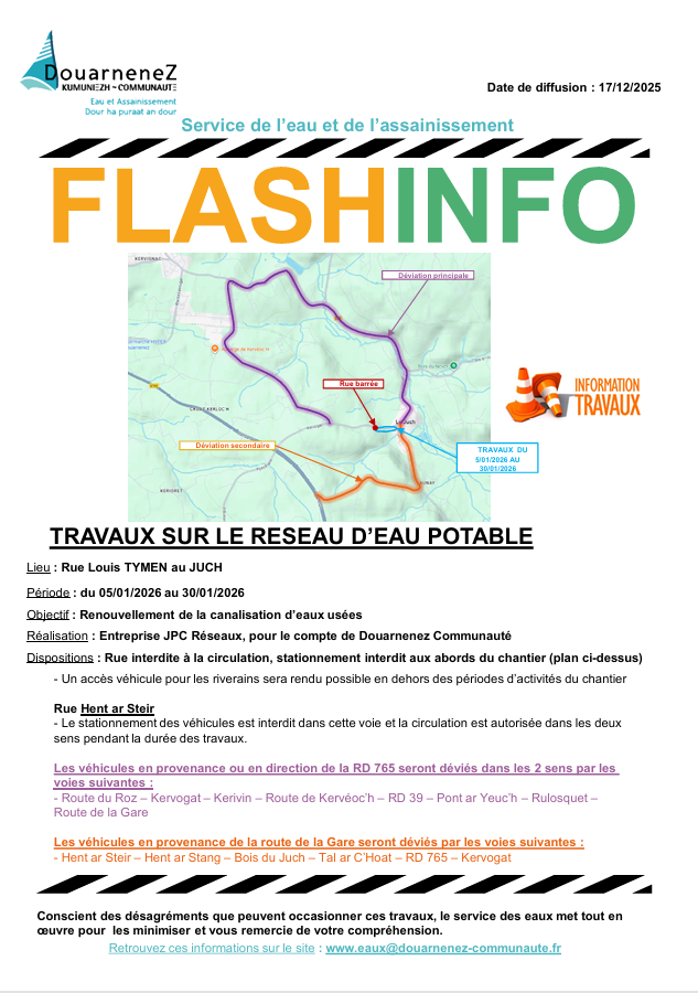 - Service Eau et assainissement : il sera fermé au public à 16h les 24 et 31 décembre. Il sera fermé au public du 25 au 28 décembre 2025 et du 01 au 04 janvier 2026. En cas d’urgence, le service d’astreinte est joignable au 06 73 98 95 91. Plus d’infos sur www.eauxdzco.bzh.