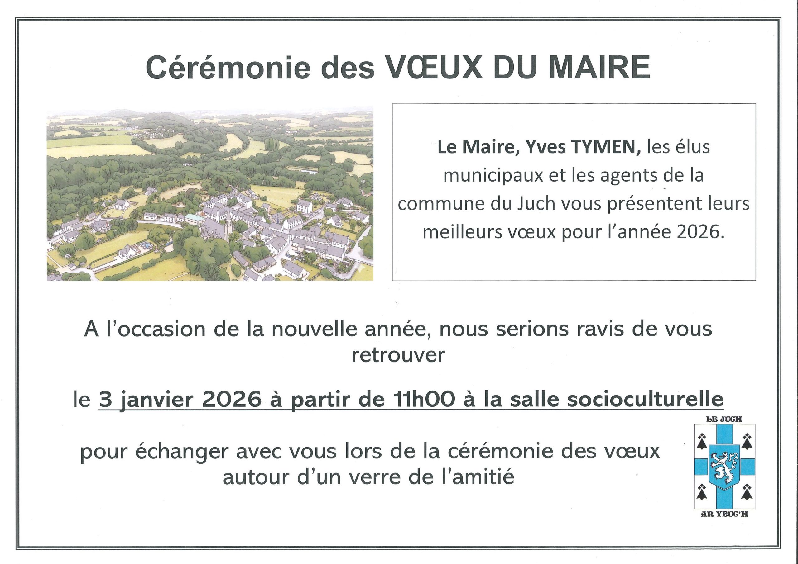 L’équipe municipale présentera ses vœux à la population le samedi 3 janvier 2026 à 11 h à la salle socioculturelle.
