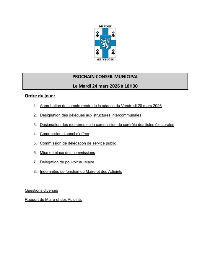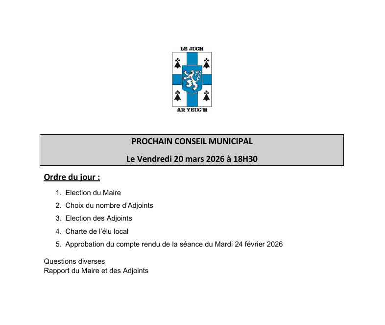 Les élections municipales se dérouleront le dimanche 15 mars 2026. Le bureau de vote sera ouvert de 8 h à 18 h à la mairie.
