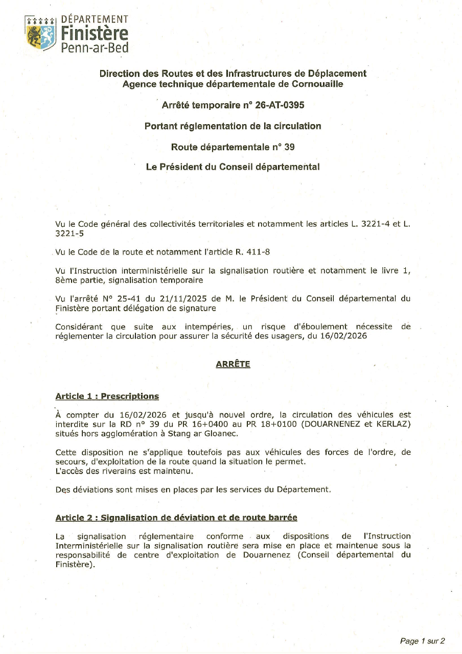 Actualité > RD 39 – ROUTE BARREE ENTRE LE JUCH ET KERLAZ
